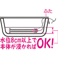 サイズ 本体:直径65×392Hmm コントロールボックス:59W×31D×127Hmm(突起物除く) 収納スタンド:86W×355D×94Hmm 電源コード:2.5m コントロールコード:3m 重量 本体:約720g 収納スタンド:約250g コントロールボックス:約120g 仕様 定格電力:AC100V 50/60Hz 定格消費電力:915W(50/60Hz) ヒーター:910W(ステンレス〈SUS316L〉カートリッジヒーター) 電気回路:5W 温度調整範囲:30℃〜45℃(ボリュ−ムツマミ調整) 適応溶液:清水 適応水量:300L(厳寒地など、又、容器の形状・材質など使用環境により異なります。