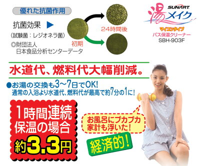 お風呂に浮かべるだけでいつでも快適保温!・節水・節燃料・省エネ!オールシーズン快適バスタイム!新機能エコモードを搭載してデビュー!!・取付工事不要!浴槽に浮ばせるだけで余裕の900W強力ヒーターが湯沸し・追い焚き保温が可能!・エコモードを新搭載!夏場は「エコスイッチ」をON! ヒーターはストップし、節電・節水・浄化モードに!・お湯を強制循環させる専用ポンプ付きですから浴槽の隅々まで均一に保温&浄化(1日約72回も循環)・クリーンフィルターと特殊活性炭が髪の毛や湯垢、臭いまでも除去する浄化機能付き! ・お湯の交換も約3日-7日に1度程度、ガス代(灯油代)や水道代をぐんと節約!最大で年間約115トンの節水も可能!上下水道代、燃料費を併せ年間で約7万-10万円以上も夢ではありません!・電気代も年間1日平均約97-114円※保温(夏場エコモードなら約16円)と大変経済的な省エネ・エコ商品!・付属の各種セラミックボールなどが温浴効果を高め、湯冷めを防ぎ身体の芯まで温めます!・銀イオン系抗菌剤の効果で、レジオネラ菌・大腸菌・ヌメリなどを強力に抑制防止するので安心入浴!・湯温調節機能(30℃-45℃)と広範囲に”季節での湯加減”がさらに細かく選べ”健美浴”を是非どうぞ!・お手入れ簡単、軽量コンパクト(約2.8kg)浮いているから取り出しもラクラク!また電源OFF後すぐに取り出してもOKです!・24時間いつでも沸きたて、朝風呂はもちろん、何度でも入浴が可能です!・もちろん信頼の「MADE IN JAPAN」です!・湯メイクは「環境に大きく配慮した優れモノ。